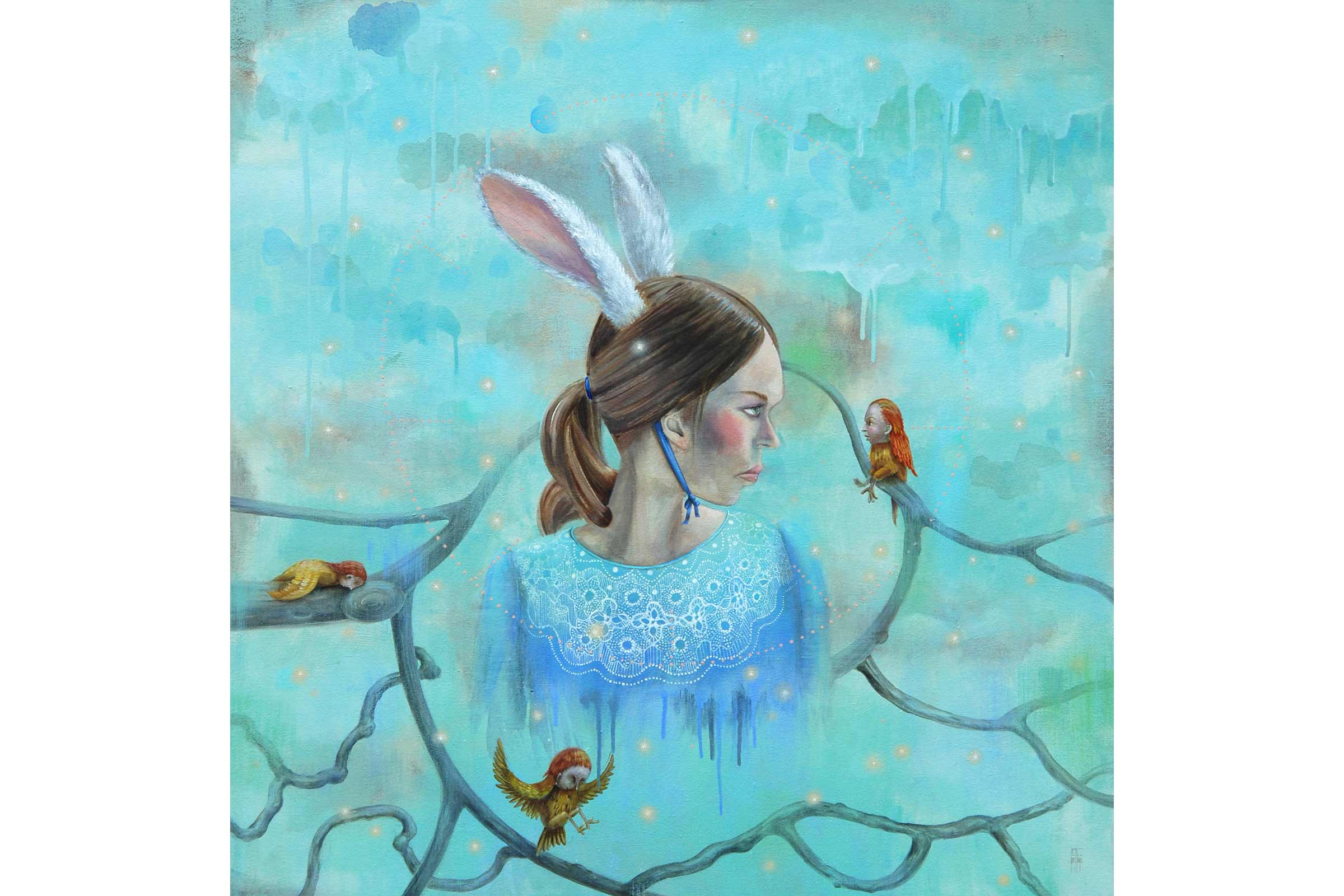 Female rabbit and birds - Acrylic on canvas - 100x100 cm - 2016 ©Christine Lucchini